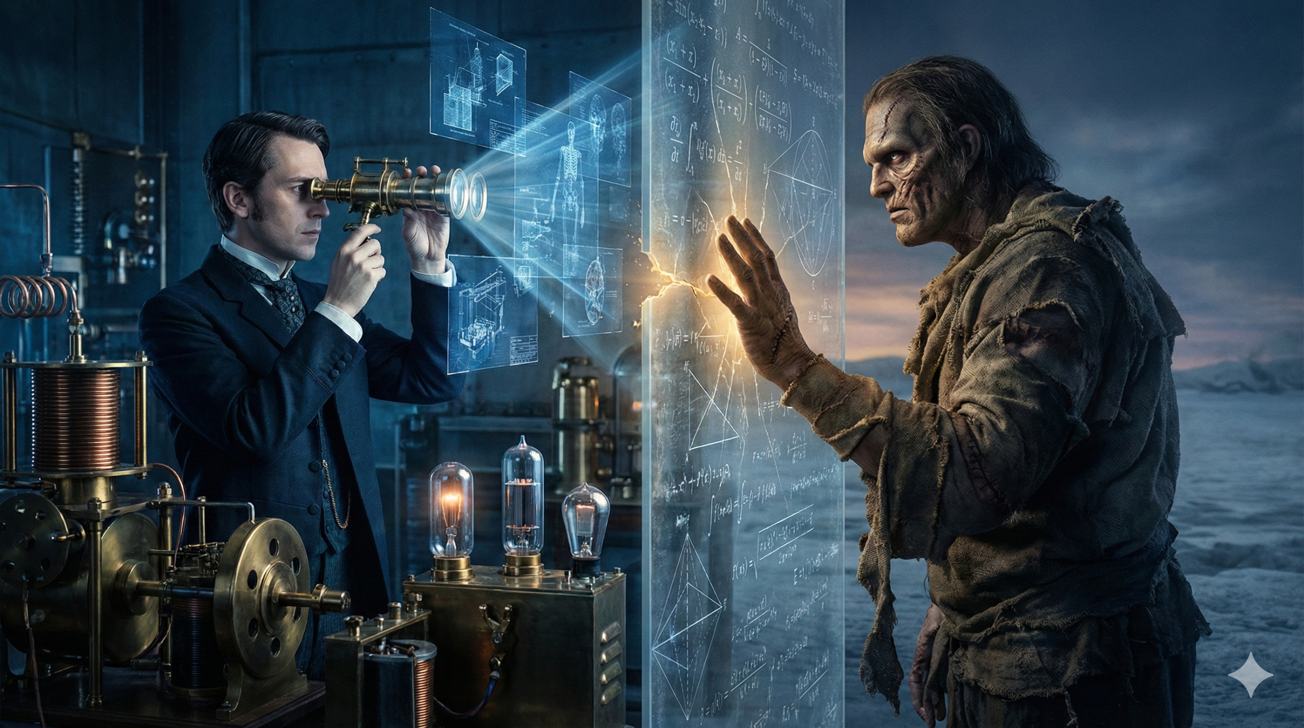 Victor Frankenstein is the archetype of rationalism that cannot abandon the limit. He acts as an expert technician: he manipulates nature—flesh, nerves, electricity—and dominates physical causality. However, he confuses the idea of life with the act of living. While thought objectifies and controls, the human person is an unrestricted and free act of being. Upon seeing the Creature awaken, Victor suffers a shock: he is confronted with a who (an uncontrollable freedom) where he expected a what. His horror is metaphysical: he closes himself within his mental limit, refusing to acknowledge that the Creature’s person infinitely exceeds his projected idea.
