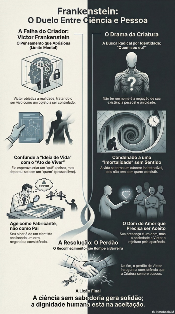 The lesson is that human dignity is not sustained by biological perfection, but by the acceptance of the act of being. The Creature possesses personal knowing and loving, but it is obscured because its creator, a prisoner of himself, refused to exercise fatherhood, which is nothing more than the highest form of coexistence. However, the final act of contrition and recognition alters the substance of the entire narrative. The tragedy of the monster without a name and without death finds its rest in that instant of forgiveness. By looking into the eyes and being looked back at, coexistence is inaugurated. Victor ceases to be the manufacturer to finally become a father.